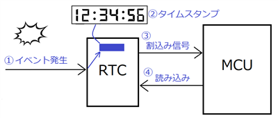 低消費電流で時刻を保持しながら、外部イベント発生時のタイムスタンプを記録できます。バックアップモード時でもタイムスタンプを記録し外部イベント入力割り込み信号を出力します。