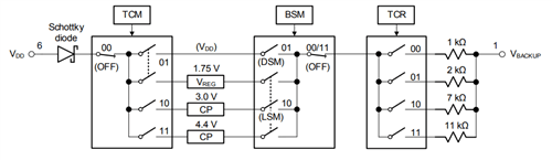 RV-3032-C7 のVbackup端子からは外付け部品無しで直接二次電池(充電リチウム電池・電気二重層コンデンサ、及び全固体電池)を充電できるトリクルチャージ機能を備えています。