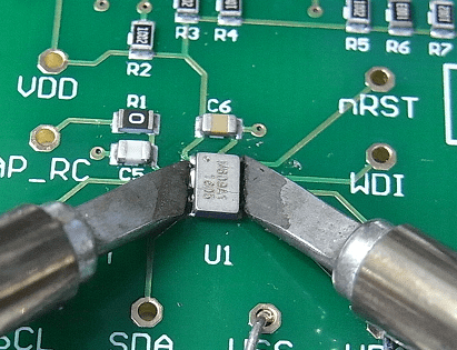 2本のはんだ小手を使用し、こて先がRTCモジュールのリッド(フタ部分)に触れない様に側面から